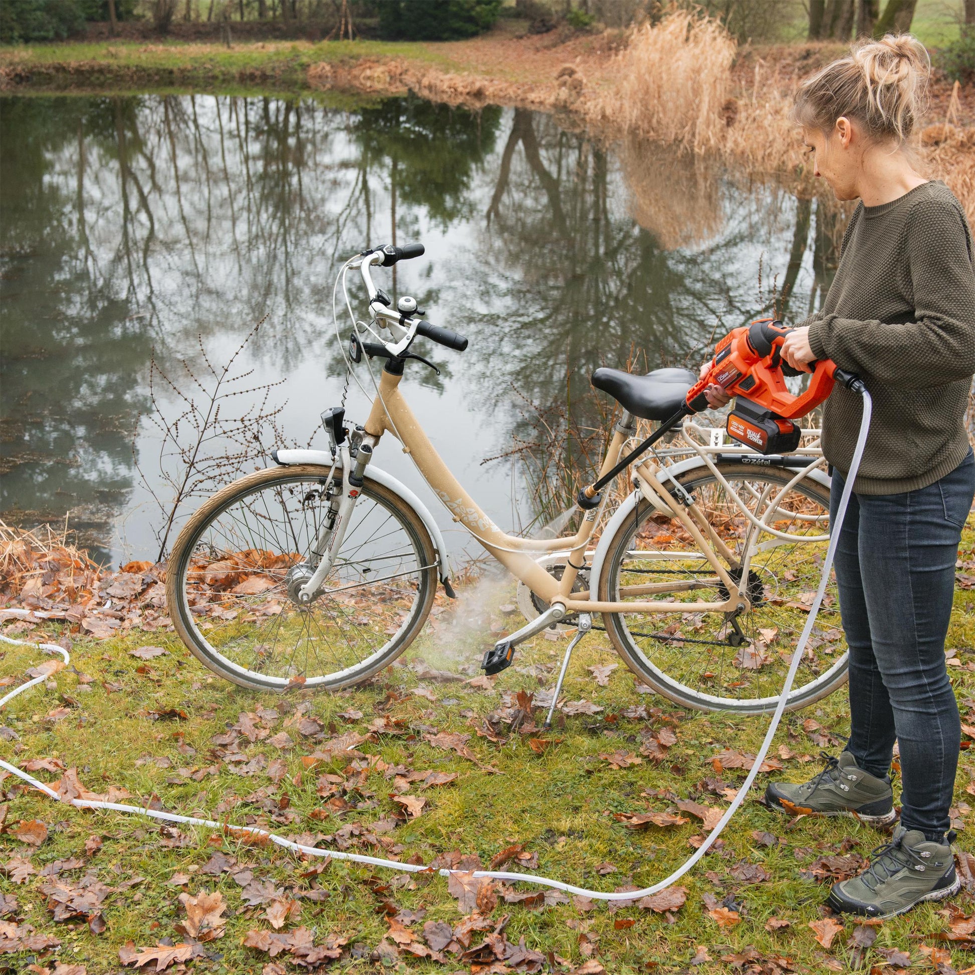 This cordless pressure washer from Dual Power is ideal for use on the road. The 20 V pressure washer is equipped with a 6 m long hose, which can draw water from remote sources, such as a lake, well or pond. Therefore, this is Dual Power tool is perfectly suited for cleaning road or mountain bikes after a muddy ride. It can also come in handy on holiday to give the car a quick rinse. The portable pressure washer can be attached to a regular tap as well, by using a standard garden hose.