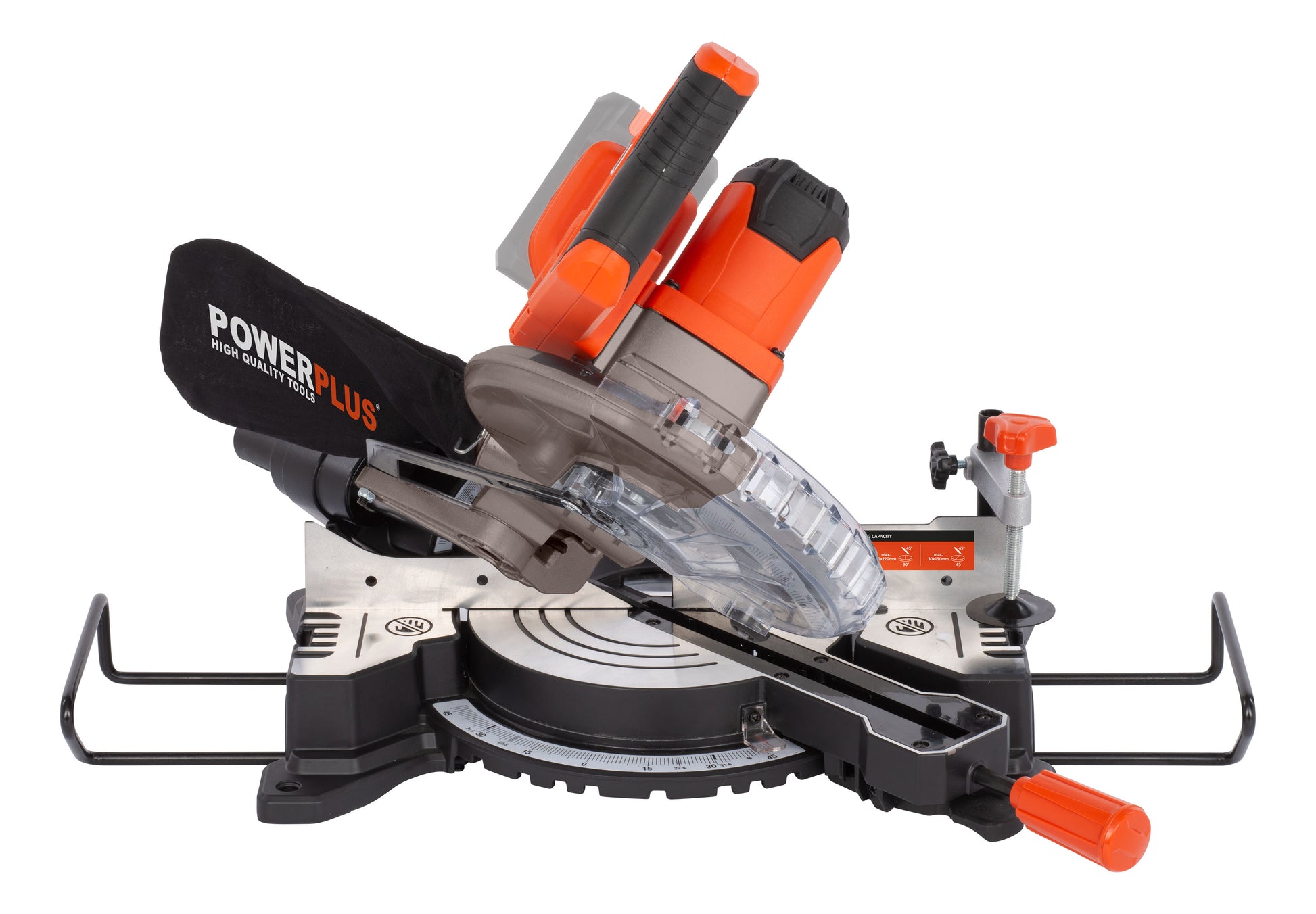 The telescopic head ensures a wide cutting range: 60 x 220 mm for regular cuts and 30 x 150 mm for 45° bevel cuts. The extension arms provide the necessary stability when working with longer boards. The clamp secures the workpiece, so the Ø210mm saw blade can do its work safely.